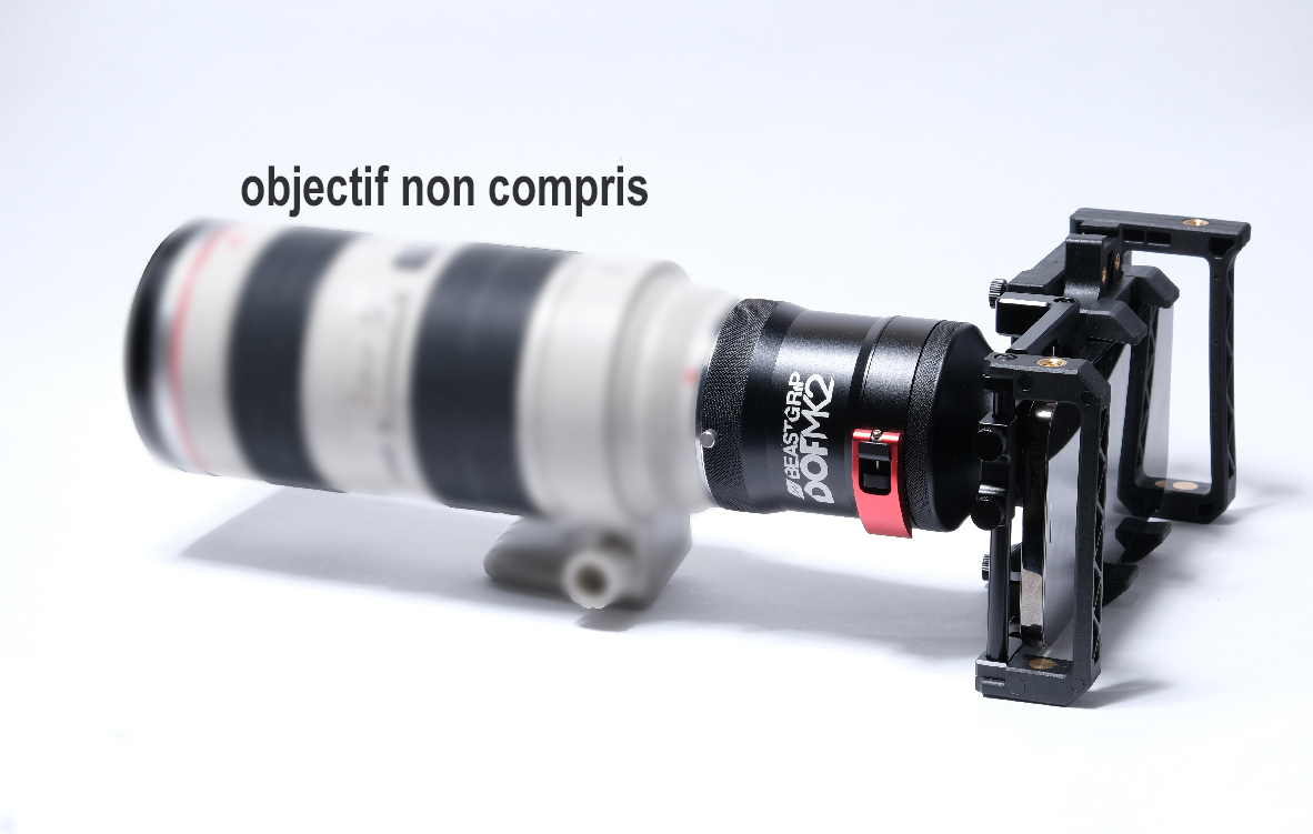 Support de smartphone réglable avec des pinces à ressort pour maintenir le smartphone. Un chariot réglable en hauteur et largeur vient se placer devant le ou les objectifs de votre smartphone afin d’y installer le « DOF »