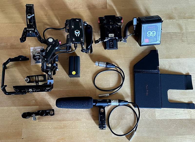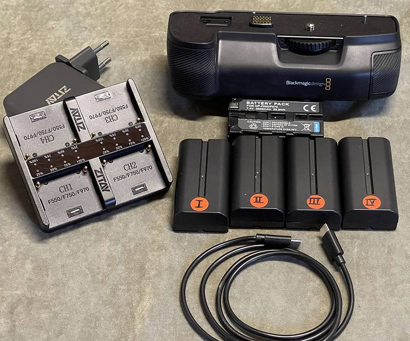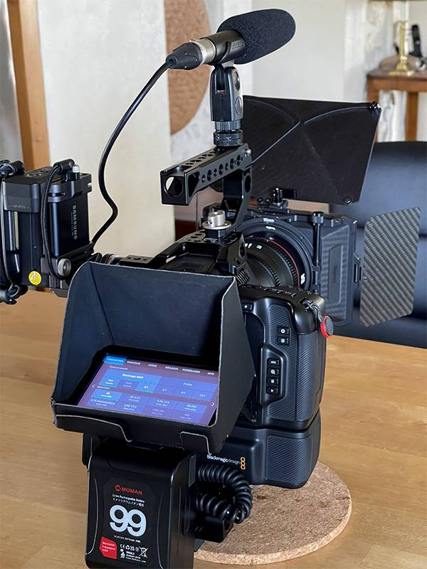 Set de tournage BMPCC 6 k Pro + battery grip + 5 batteries NPF 750 Originales de Black Magic + cage Tilta avec Folofocus + V Mount Batterie, Moman Power99 V-Lock avec chargeur + Micro canon Audio -Technica AT875R + Matte box + bonnette Rycote + objectif Meike 25mm T.2 neuf.