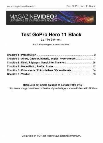 PDF sans publicité du "Test GoPro Hero 11 Black" Ce PDF payant reprend dans son intégralité le test du même nom. Ce test se trouve ici. L'achat du PDF vous permet de lire le test en dehors de son environnement Web et sans aucune publicité. Le PDF est une conversion de l'article Web, induisant quelques modifications graphiques mineures (saut de paragraphe, photos) Il offre une alternative à la souscription de l'abonnement Premium ou l'achat à l'unité si vous avez des besoins ponctuels de consultation et souhaitez un PDF. Sa lecture est réservé à votre usage personnel. Le PDF ne doit pas être distribué ni modifié ni mis en vente. Cliquez ci-dessus et une fois la commande passée, vous pourrez télécharger le fichier PDF en allant en rubrique Téléchargement des PDF des Articles / Tests. Vous recevrez également un email vous indiquant le lien et vous confirmant la validation de votre achat. Prix du PDF : 2 euros TTC. Prix des PDF suivants : 1,5 euros. Paiement en ligne sécurisé par CB ou PayPal. -
