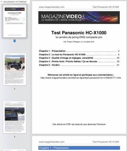 PDF sans publicité du test Panasonic HC-X1000 Ce PDF payant reprend dans son intégralité le test du même nom. Ce test se trouve ici. L'achat du PDF vous permet de lire le test en dehors de son environnement Web et sans aucune publicité. Le PDF est une conversion de l'article Web, induisant quelques modifications graphiques mineures (saut de paragraphe, photos) Il offre une alternative à la souscription de l'abonnement Premium ou l'achat à l'unité si vous avez des besoins ponctuels de consultation et souhaitez un PDF. Sa lecture est réservé à votre usage personnel. Le PDF ne doit pas être distribué ni modifié ni mis en vente. Cliquez ci-dessus et une fois la commande passée, vous pourrez télécharger le fichier PDF en allant en rubrique Téléchargement des PDF des Articles / Tests. Vous recevrez également un email vous indiquant le lien et vous confirmant la validation de votre achat. Prix du PDF : 2 euros TTC. Prix des PDF suivants : 1,5 euros. Paiement en ligne sécurisé par CB ou PayPal. -